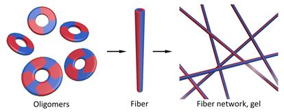 该课题组利用梁高林博士发展出的一个独特的缩合反应平台(Nat. Chem. 2010, 2: 54-60)。该工作使用还原剂谷胱甘肽(Glutathione)控制小分子的缩合,用溶液酸碱性控制低聚物的自组装,得到低聚物纤维,并形成水凝胶(如下图)。表征结果证明缩合得到的化合物为低聚物,水凝胶的力学强度低于许多高分子水凝胶但却高于大多数小分子水凝胶。