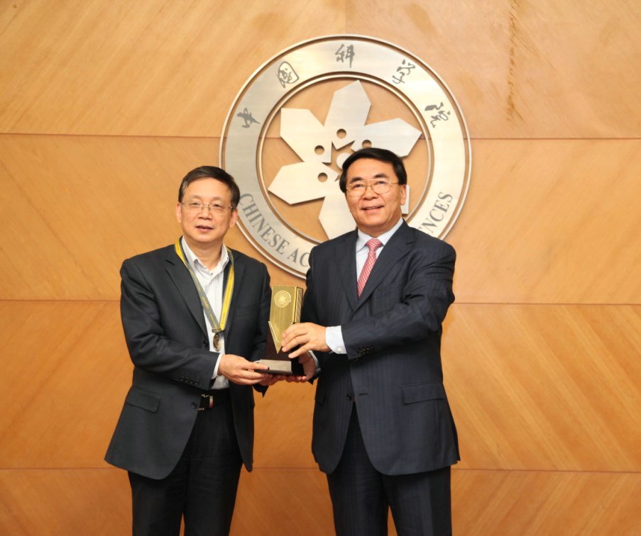 中国科学学院院长白春礼为获奖代表侯建国院士颁发奖杯