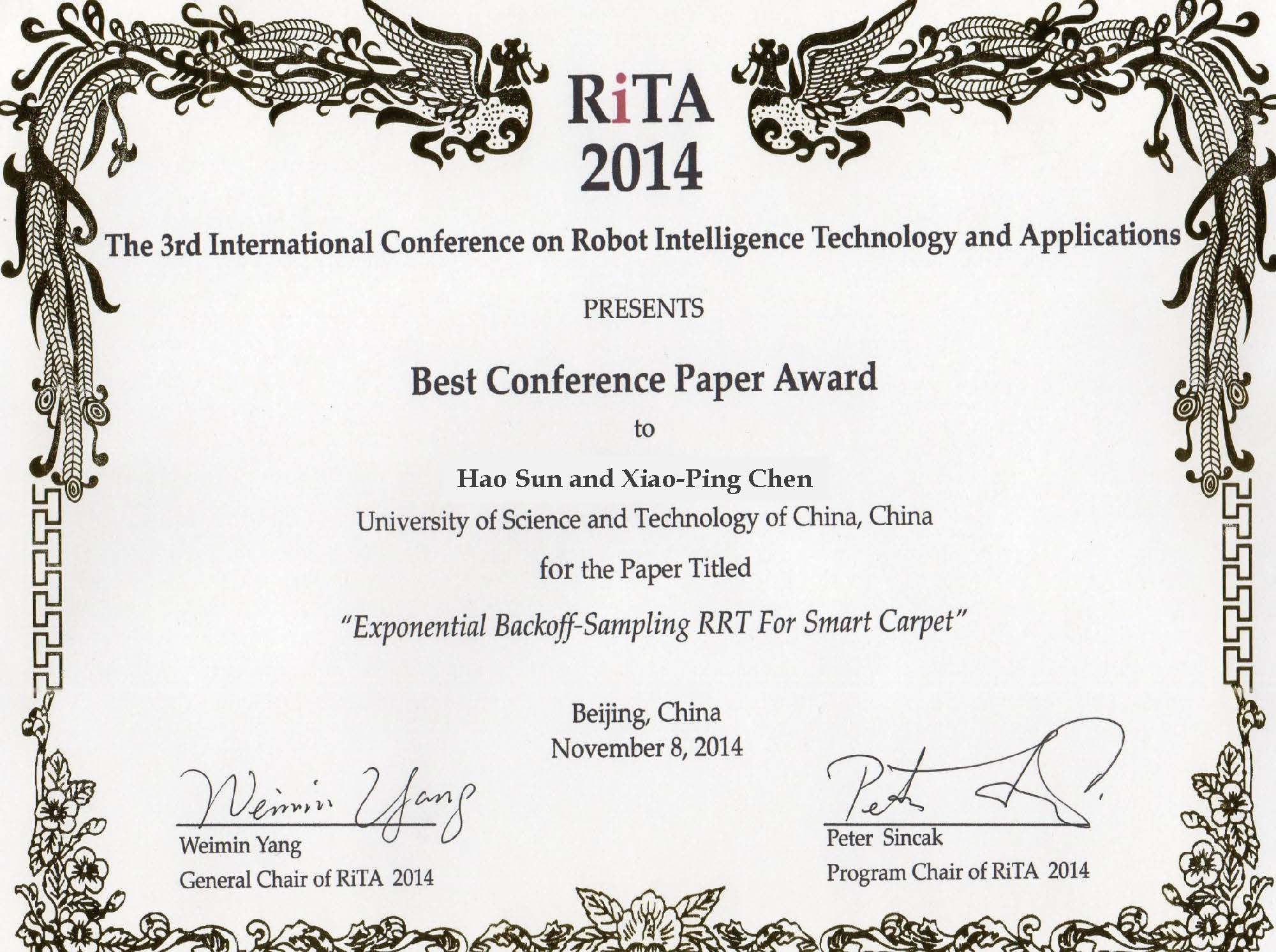 我校可佳机器人团队硬件组提出,将云机器人技术与智能织物技术相结合,利用廉价的智能织物作为非机载传感器,广泛用于室内环境中与人活动相关的信息感知手段,从而显著地提高机器人的环境感知能力,并具有比传统传感器更低廉的价格和更好的隐私保护潜能。针对海量感知信息对机器人实时规划产生的计算障碍,提出了一种新的室内定位规划算法,显著地提高了规划性能,已可满足普通家庭或办公环境中机器人运动规划的响应时间和规划精度要求。在11月8日结束的第三届国际机器人智能技术及应用(The Third International Conference on Robot Intelligence Technology and Applications)学术大会上,报告该研究成果的论文Exponential Backoff-Sampling RRT For Smart Carpet获得唯一的“最佳大会论文奖”(The Best Conference Paper Award),并获颁代表大会最高荣誉的、唯一的金钥匙奖章。论文第一作者为计算机学院博士生孙昊。