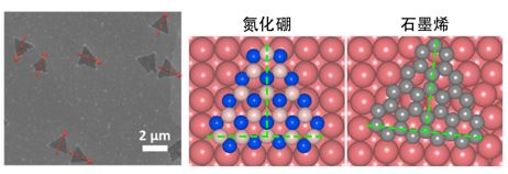 氮化硼生长在铜(100)衬底上的SEM图像(左)以及理论计算得到的氮化硼与石墨烯相对于衬底的高低不同的对称性取向(右)