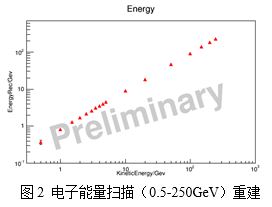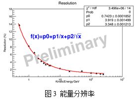 CERN建造有世界上能量、亮度最高的对撞加速器,可以提供世界上最高能量的粒子束进行各种物理实验和探测器测试与标定。DAMPE谱仪所涉及的粒子能量之高,动态范围之大,只有在CERN可以进行相应实验。此次DAMPE谱仪的束流实验分别是在其质子回旋加速器(The Proton Synchrotron,简称:PS)和超级质子回旋加速器(The Super Proton Synchrotron,简称:SPS)上进行。实验期间,谱仪研制人员在PS的T9束线上重点研究了DAMPE谱仪对0.5GeV~5GeV的电子和0.5GeV~3GeV的伽玛射线响应;在SPS束线上重点研究了5GeV~250GeV的电子和20GeV以下的伽玛射线与DAMPE谱仪的作用,并利用SPS束线上游的400GeV质子束(pure primary beam)对DAMPE谱仪的粒子鉴别能力进行研究。束流测试的结果表明DAMPE谱仪的探测器、电子学、在线控制装置和相关数据分析软件都是正确、可靠的。图1是PS T9束流实验的实验现场照片;图2给出了电子能量从0.5GeV到250GeV扫描的BGO量能器能量重建曲线;图3是BGO量能器对不同电子入射能量的能量分辨率。初步数据分析表明,DAMPE谱仪的能量响应线性较好,满足设计需求,能量分辨率为1% @ 200GeV,好于任务指标要求。进一步的数据深入分析正在进行之中。