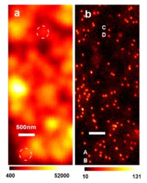 图. a,b分别是普通共聚焦扫描显微成像和利用电荷态耗尽高精度成像测量的结果。b图中每个亮点都对应着单个金刚石NV色心。