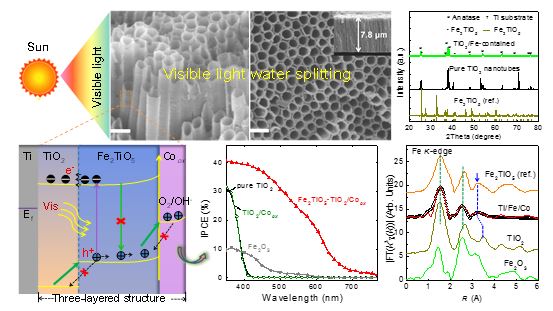 针对以上科学难点问题,他们从理论上提出一种通过形成“矢量迁移通道”的能级结构来引导光生载流子迁移的途径。实验上,通过将一层2~3 nm厚的Fe2TiO5窄禁带(2.2 eV)半导体材料包覆在高度有序的TiO2纳米管阵列表面,在Fe2TiO5/TiO2之间形成载流子分离界面,成功地将光生空穴从材料内部定向迁移到表面催化反应活性位点;同时,Fe2TiO5与TiO2匹配的导带结构极大减小了水分解反应的过电势,从而使得Fe2TiO5-TiO2复合结构在400-600nm波长范围的量子转换效率高达40%以上,总的能量转换效率达到2.7%。并利用同步辐射X射线吸收谱学和电化学阻抗谱技术等一系列测量和理论分析,证实了Fe2TiO5-TiO2界面的“矢量迁移通道”能级结构是实现光生载流子定向迁移的原因。审稿人认为“这项工作所提出的载流子分离方法和通过能级剪裁来降低水分解起始电势的途径在太阳能水分解领域有着非常重要的潜在意义”。