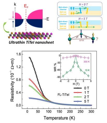 图:阴离子碘固溶实现二维TiTeI能带打开;Ti3+局域磁阻的自旋阻挫构形导致电子自旋相关散射;超薄TiTeI纳米片的巨磁阻效应。