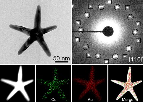 “一闪一闪亮晶晶,满天都是小星星......”,这首家喻户晓的儿歌激发了我校合肥微尺度物质科学国家实验室(筹)及化学与材料科学学院的曾杰教授课题组的研究灵感,研究人员进而发明了一种星形纳米材料,其集双宠于一身,兼具优良的光学性质和催化性能。该工作以“Facile synthesis of pentacle gold–copper alloy nanocrystals and their plasmonic and catalytic properties”为题发表在近日出版的《自然?通讯》上(Nature Commun. 5:4327 DOI: 10.1038/ncomms5327)。
