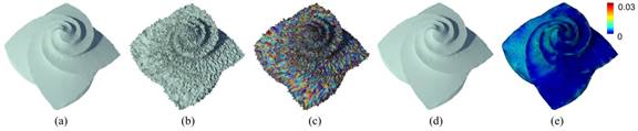 新方法保特征示例:(a) 作为真实答案的八花模型;(b) 加噪音后的八花模型;(c) 噪音的颜色可视化;(d) 新方法的保特征去噪结果;(e) 去噪曲面与真实答案之间误差的颜色可视效果,表明新方法能够忠实地复原被噪声污染的尖锐几何特征。