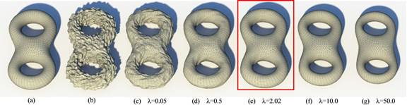 算法参数选取示例:(a) 真实网格曲面(作为答案);(b) 加噪音后的网格曲面(作为输入);(c)-(g) 分别对应于不同平滑参数的去噪结果曲面;新方法能自动选取最优的平滑参数λ=2.02并获得最佳的去噪效果(e).