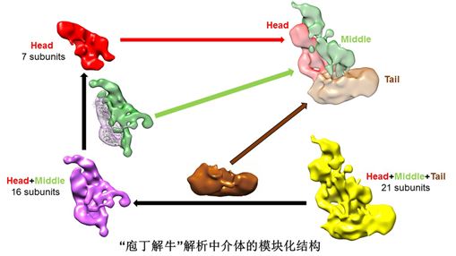 中介体(Mediator complex)在转录中扮演关键角色,被称为“转录中央控制器”。它是由几十个不同蛋白质组成的庞大的分子机器,由头部、中部、尾部3个稳定模块构成;其模块化结构和亚基组成从低等的酵母到高等哺乳动物高度保守。冷冻电镜(cryo-EM)是当前能够解析完整中介体三维结构的唯一方法;但受限于结构上的复杂性,已报道的电镜结构分辨率很低,无法定位各个模块,甚至头部模块的晶体结构对接到中介体电镜结构的位置都不确定。原先对于中介体的模块化结构认识模糊,且与大量结构和功能实验数据相抵触,大大限制了对中介体精细结构和作用分子机制的认识。