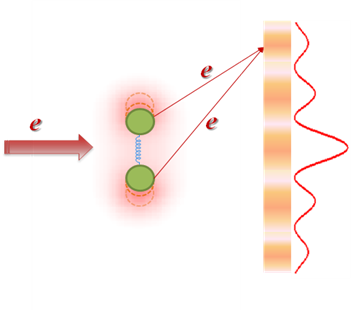 使粒子具有相干性的另一种机制是粒子从空间不同位置出射的相干叠加,同核双原子分子的电离提供了这种分子尺度“双缝”干涉实验的例子(如图所示),电离电子从两个原子相干出射,电子波的叠加导致可观测的干涉效应。