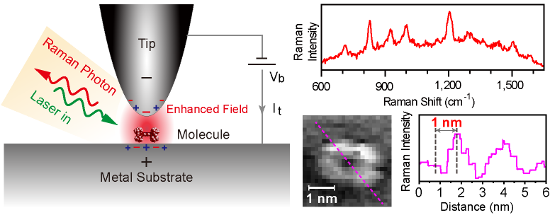 图片说明:左图是STM控制的针尖增强拉曼散射测量原理示意图。图中所示为共焦边照射实验构型,Vt是加在样品上的偏压,It为控制探针与衬底间距的隧穿电流。当一束激光聚焦到金属针尖与衬底之间的纳腔时,就会产生很强的高度局域化的等离激元电磁场,后者会显著增强针尖下单个分子的拉曼散射信号。右上图为分子拉曼光谱,右下图为拉曼成像图和强度分布曲线。