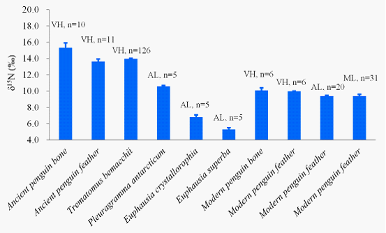 图1: 东南极现代企鹅、企鹅食物及古代企鹅N同位素比值组成