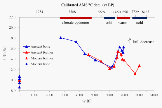 过去7年来,在上述工作基础上,孙立广、黄涛研究小组通过对现代和古代企鹅骨骼、羽毛的稳定N同位素和加速器质谱14C定年分析,进一步研究了东南极西福尔丘陵全新世以来阿德雷企鹅的古食谱。据此首次获得了东南极海域过去8000年来磷虾数量变化。过去8000年来,阿德雷企鹅稳定N同位素发生了明显的波动并与气候冷暖变化紧密相关。南极磷虾是一种喜冷水环境的南大洋食物链关键物种,对气候海冰变化极为敏感;气候温暖时期磷虾数量偏低,企鹅食物偏向鱼类,而偏凉时期相反。由此发现自然气候变化影响了企鹅食谱的变化和磷虾种群动态变化。南极磷虾是企鹅的首选食物,企鹅组织的N同位素变化间接反映了食谱变化。前人的研究表明,生物组织N同位素的高低反映了食谱营养级的高低,由此,南大洋磷虾及食物链变化通过企鹅遗存序列的N同位素被发掘出来。对比现代和古代企鹅N同位素比值,现代企鹅N同位素比值显著亏损,指示磷虾数量丰富,支持南大洋‘磷虾假说’。研究表明,近百年来气候变暖,但是人类对南极海豹和鲸的猎杀导致磷虾天敌减少,从而使磷虾种群密度不降反增。这是人类活动影响海洋生态系统的典型案例。