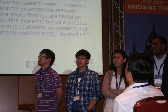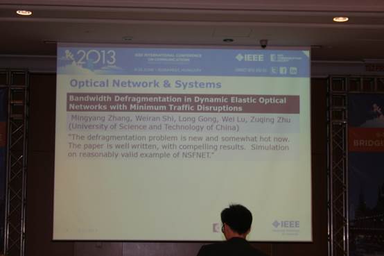 IEEE ICC是IEEE通信协会(IEEE Communications Society)的旗舰会议,于每年六月中旬定期召开,它涵盖了包括信息论、通信信号处理、无线通信、无线网络、光网络、多媒体通信和信息安全等在内的通信行业的各个领域。此次大会从2423篇投稿中根据研究领域评选出17篇最佳论文,朱祖勍博士团队的论文获得了光网络领域唯一的最佳论文奖(Best Paper Award),该文研究了动态弹性光网络中的带宽去碎片化问题,提出了对网络流量影响最小的高效去碎片化算法,并运用仿真验证了其性能。大会最佳论文评审委员会对该文的获奖评语是:“The defragmentation problem is new and somewhat hot now. The paper is well written, with compelling results. Simulation on reasonably valid example of NSFNET”。(碎片整理是时下崭新而热门的课题。该论文构写精妙,并取得了令人瞩目的成果,是对NSFNet进行模拟的合理有效的例子。)