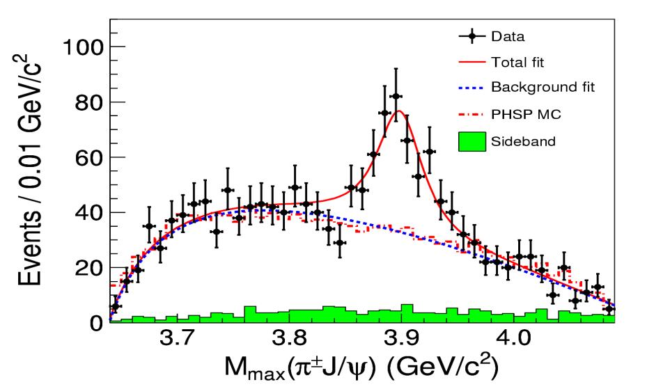 北京谱仪III(BESIII)实验国际合作组今天宣布,在最近采集的4.26GeV能区数据中发现了一个新的共振结构,暂时将其命名为Zc(3900)(见下图)。