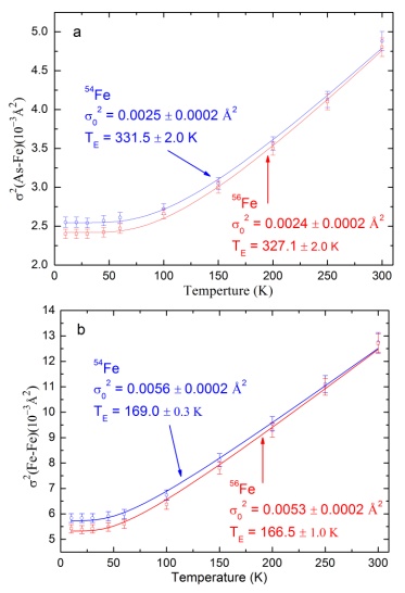 超导体,同位素掺杂对Fe-As和Fe-Fe的平均健长和静态分布几乎没有影响,但调制它们的热无序分布;通过关联爱因斯坦模型可以精确获取不同铁同位素样品的Fe-As和Fe-Fe特征振动频率,从而测定了Fe-As和Fe-Fe局域晶格振动的同位素效应因子。这种微观方法测得的同位素效应因子与电阻和磁化率测量的同位素指数基本相同,进一步表明电-声子相互作用在