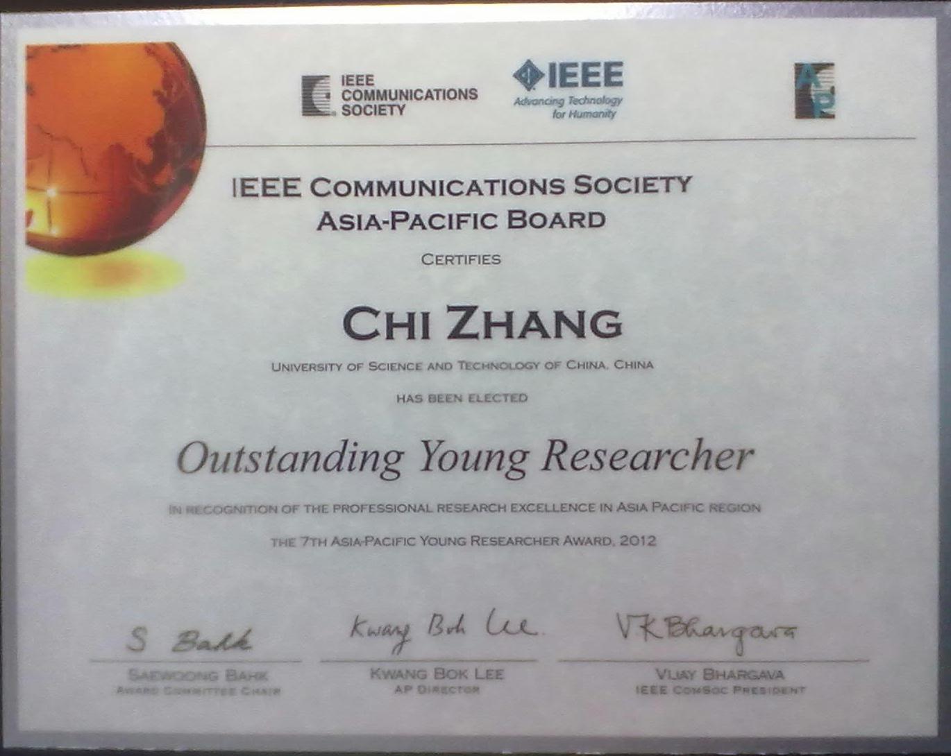 12月4日,信息科学技术学院轨道制副教授张驰博士在美国加州Anaheim举行的颁奖典礼上获得IEEE通信学会(IEEE Communications Society)颁发的第七届IEEE亚太地区杰出青年研究员奖(IEEE Asia-Pacific Outstanding Young Researcher Award)。该奖项设立于2001年,由IEEE通信学会组织评选,迄今已是第七次颁发。依照评奖章程,获奖者年龄须在三十五岁或以下,目前在亚太地区工作,过去三年内在学术论文发表和参与世界知名学术会议等方面皆有杰出的表现。颁奖典礼一般在当年IEEE通信领域的旗舰会议GLOBECOM 上举行。张驰副教授今年因其在无线网络和网络安全方面的研究贡献而获奖。