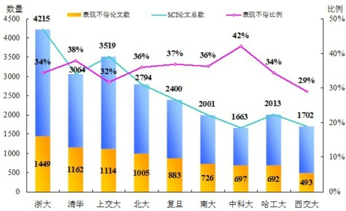 2011年,我校以第一作者机构发表SCI论文1663篇,较2010年增长了153篇,增长约10%。其中,有697篇表现不俗(指论文发表后的影响超过其所在学科的一般水平),较2010年的增加了296篇,增长了70%多。我校表现不俗论文占SCI论文总数的42%,稳居C9高校第一。