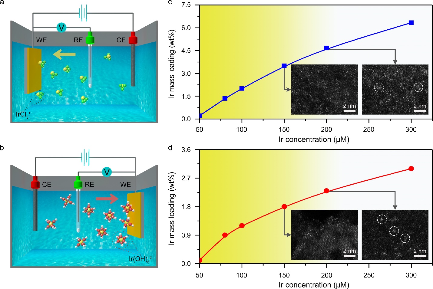图1.电化学沉积制备单原子的机理研究。(a)阴极沉积示意图;(b)阳极沉积示意图;(c)在阴极沉积中,前驱体浓度、沉积量和单原子形成的关系;(d)在阳极沉积中,前驱体浓度、沉积量和单原子形成的关系。