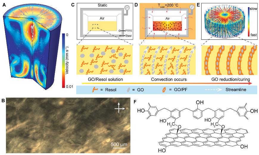 图1.利用GO的液晶行为和凝胶化能力揭示间歇式水热合成中的流场。A,室温下一杯冷水中存在的随机流场。B,氧化石墨烯的液晶行为。C-E,GO纳米片沿流线方向排列并由酚醛树脂固定。F,GO与酚醛树脂结合的分子结构图。