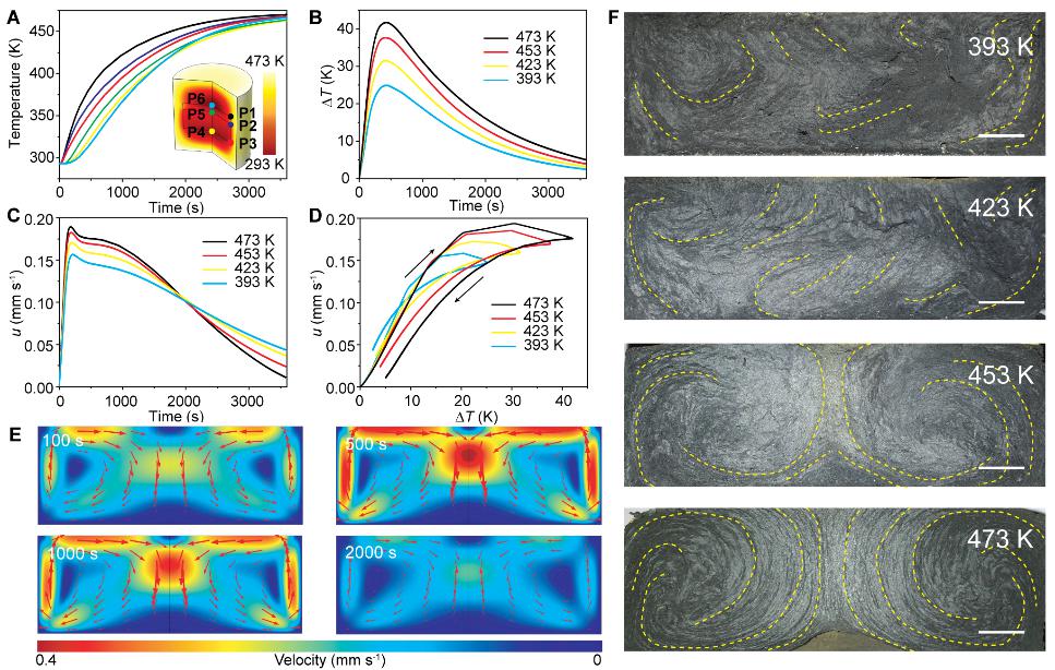 图2.间歇式水热反应釜中温度场和流场的有限元模拟。A,不同位置的温度变化曲线。B-D,不同温度下溶液的温差—时间、流速—时间和流速—温差曲线。E,水热过程中流场的变化过程。F,在不同设定温度下GO / PF凝胶的横截面照片。