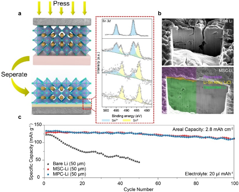 进一步地,研究人员发展了方便的固相转印方法,将旋涂法制备的高质量氯基钙钛矿 (MASnCl3和MAPbCl3)薄膜原位地转移到在锂箔表面,形成具有梯度结构的导锂层 (图2 a)。该金属卤化物钙钛矿导锂层可以改善电解液与锂金属的界面问题,实现致密的锂金属沉积和脱出,避免了锂枝晶生长和锂金属电极的粉化(图2 b)。最终的锂金属全电池电化学循环测试表明,在金属卤化物钙钛矿导锂层的保护下,即使在贫锂(50 μm)和有限电解液(20 μl mAh-1)以及2.8 mAh cm-2面容量的严格条件下循环100圈后容量仍保持在80%以上,而没有保护层的锂金属电池在循环50圈后容量已降低到初始的40%(图2 c)。