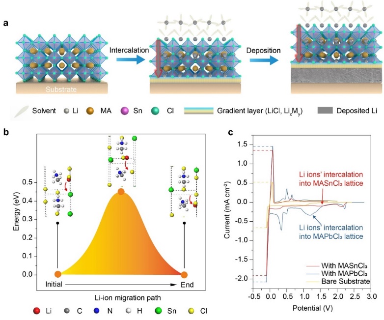 图1 金属卤化物钙钛矿框架的锂离子传导特性机理探究。a,锂离子在金属卤化物钙钛矿晶格中的迁移并均匀沉积在基底的示意图。b,锂离子在金属卤化物钙钛矿MASnCl3晶格中的迁移能垒计算。c,旋涂有金属卤化物钙钛矿薄膜电极的循环伏安曲线。