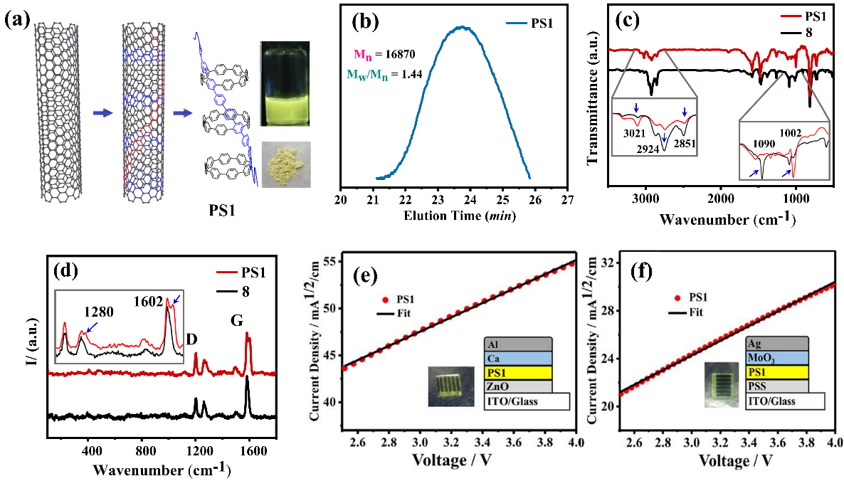 图2.单一手性碳纳米管的长共轭链段结构PS1及其性质研究。(a)PS1的结构及其在溶液中发光; (b-d) PS1的凝胶渗透色谱、红外和拉曼光谱表征以及与单体8对比结果;(e-f) PS1中的载流子输运性质,兼具电子传输和空穴传输性能。