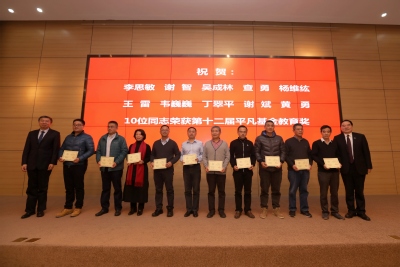 蒋一副书记宣读相关表彰文件,李思敏、谢智、吴成林、查勇、杨维纮、王雷、韦巍巍、丁翠平、谢斌、黄勇等10位同志获第十二届平凡基金-教育奖。