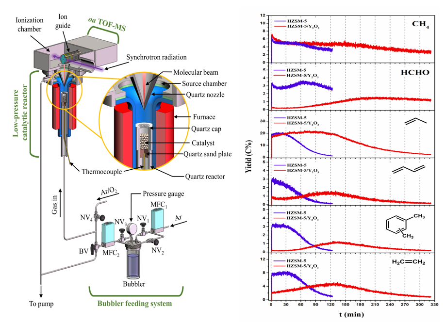 潘洋课题组研发了原位低压催化反应器结合同步辐射光电离飞行时间质谱的实验装置,可实现MTH反应产物的原位、快速质谱探测及定性和定量。该装置对甲醛有很好的信号响应,反应器提供的低压环境还可以避免甲醛发生二次反应,从而可以观察和揭示MTH反应及相应的失活机理。该工作研究了使用催化剂HSAPO-34和HZSM-5时,MTH完整反应过程中(诱导期、稳定期和失活期)甲醛以及其他产物实时的产量变化(图2)。实验结果发现甲醛和甲烷有类似的形成趋势,产量上也有紧密的联系,表明甲醛主要产生于甲醇在酸性位点上发生的歧化反应。将催化剂与Y2O3进行机械混合,可以发现反应产生的甲醛被消除,进而影响了MTH反应中烯烃到芳烃和芳烃到积碳的氢转移过程。同时实验还发现了甲醛产量的变化会影响到MTH反应中芳烃循环的贡献和乙烯的产量,从而进一步证实了乙烯的形成主要来源于烃池中的芳烃循环。这些研究成果更加明确了MTH反应中甲醛的形成和演化机理,将有助于新型催化剂的设计和改良。