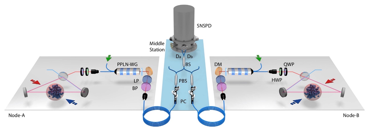 中国科学技术大学潘建伟、包小辉、张强等与济南量子技术研究院和中科院上海微系统与信息技术研究所合作,在量子中继与量子网络方向取得重大突破。他们通过发展高亮度光与原子纠缠源、低噪高效单光子频率转换技术和远程单光子精密干涉技术,成功地将相距50公里光纤的两个量子存储器纠缠起来,为构建基于量子中继的量子网络奠定了基础。该成果于近日发表在国际知名学术期刊《自然》上。