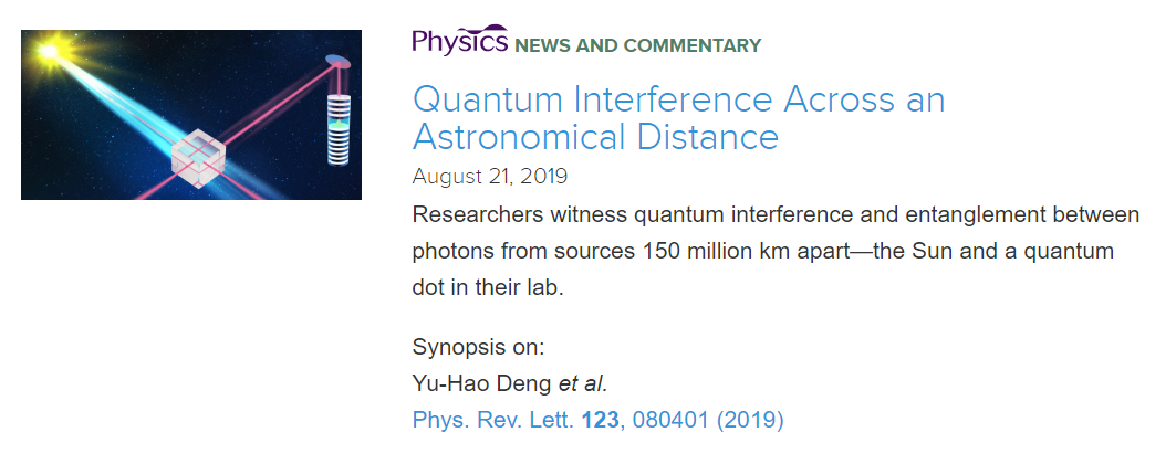 中国科学技术大学潘建伟、陆朝阳等和浙江大学王大伟、美国普林斯顿大学Marlan Scully、德国维尔兹堡大学Sven Hofling、美国路易斯安那州立大学Jonathan Dowling、上海纽约大学Tim Byrnes合作,在国际上首次实验观察到量子点单光子和太阳光之间的双光子干涉、量子纠缠以及非定域性。该研究工作把独立光子之间的量子干涉实验扩展到相距1.5亿公里的两个独立光源,首次在天文学尺度上检验了量子统计原理的普适性,并给出了热光场量子化的直接实验证据。这一研究成果近日以“编辑推荐”的形式发表于国际权威学术期刊《物理评论快报》。
