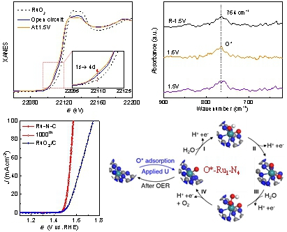 针对这些关键性科学问题,国家同步辐射实验室姚涛教授课题组与化学与材料科学学院杨金龙教授课题组合作,发展原位同步辐射吸收谱和红外技术,并结合理论计算,首次精确探测到钌基单原子催化剂在酸性电化学析氧反应过程中的催化活性位点的动态变化过程,并依此设计出高活性和高稳定性的酸性OER催化剂,研究成果2019年10月24日以“Dynamic oxygen adsorption on single-atomic Ruthenium catalyst with high performance for acidic oxygen evolution reaction”为题,在线发表于《自然·通讯》杂志(Nature Communications DOI:10.1038/s41467-019-12886-z)。中国科大博士生曹林林和特任副研究员罗其全是论文的共同第一作者。