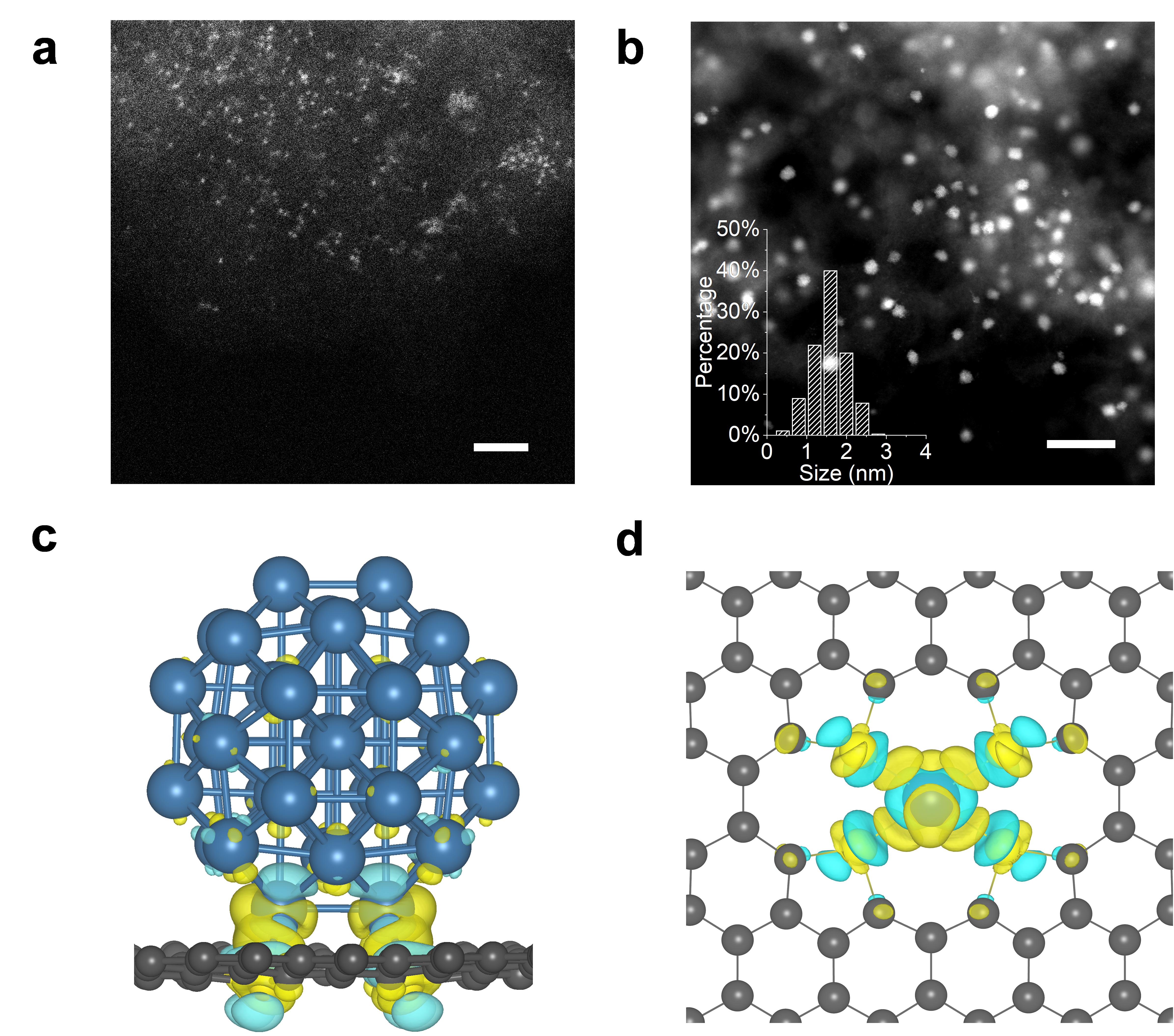 图2. S-C负载的Pt单原子与Pt团簇的结构表征:(a)Pt单原子的HAADF-STEM图;(b)Pt纳米团簇的HAADF-STEM图;(c)Pt纳米团簇的差分电荷密度分析;(d)Pt单原子的差分电荷密度分析。