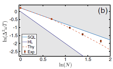 噪声适应的量子精密测量实验装置图和实验结果图。结果展示测量精度超越了标准量子极限(SQL)。