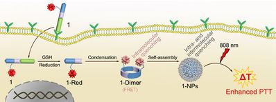 光热疗法(PTT)由于其非侵入性、时空控制精确、特异性强、肿瘤破坏效率高等优点,已成为肿瘤治疗领域的研究热点,有望用于临床上多种癌症的治疗。高效率光热试剂(PTA)的设计与合成是癌症光热治疗成功的关键。近年来,采用原位自组装诱导PTA的荧光猝灭(即分子间荧光猝灭)提高其光热效率已被证明是增强肿瘤PTT的有效策略。但迄今为止,利用PTA同时发生分子内和分子间荧光猝灭来增加其光热效能的研究尚未见报道。梁高林教授基于本课题组特色的CBT-Cys点击缩合反应,合理设计并合成了有机小分子染料Biotin-Cystamine-Cys-Lys(Cypate)-CBT (1)。1可特异性识别生物素受体高表达的癌细胞,当1被癌细胞摄取后,其会被细胞内大量存在的GSH还原,随后发生CBT-Cys点击缩合反应形成二聚体。由于距离的拉近,二聚体中的两个染料分子会发生荧光共振能量转移(FRET)使其荧光发生猝灭 (分子内荧光猝灭)。随后,二聚体将原位自组装形成纳米粒子,染料分子之间会发生分子间电荷转移,从而荧光猝灭进一步增强。在激光照射下,这种分子内和分子间的荧光猝灭可增强染料的非辐射激发过程,从而增加了染料的热转化效率,增加其对癌细胞和肿瘤的光热治疗效果(见下图)。在与江俊教授、张群教授以及王广凤教授合作下,理论计算和实验都成功验证了这一“智能”策略。染料分子的产热能力、光热转化效率、以及光稳定性明显优于单一的染料分子间(或分子内)的荧光猝灭策略。利用这一“智能”策略,他们成功实现了对活体肿瘤的光热治疗效果的大大增强。该策略为增强小分子光热转换效率提供了一种可行且可靠的手段,也为它们的临床转化提供了保障。更重要的是,通过用其他靶向配体取代1中的Biotin,这种“智能”策略有望用于其它疾病的光热治疗。