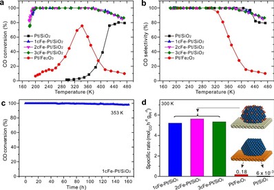 图2.利用ALD方法制备出来的1cFe-Pt/SiO2、2cFe-Pt/SiO2、3cFe-Pt/SiO2单位点界面催化剂和常规Pt/SiO2、Pt/Fe2O3催化剂在PROX反应中的催化性能对比。(a)CO转化率;(b)CO选择性;反应条件:1% CO、0.5% O2和48% H2,平衡气为氦气,空速为36,000 ml g?1 h?1,压力为 0.1 MPa。(c)1cFe-Pt/SiO2催化剂的长时间稳定性测试。反应条件:1% CO、0.5% O2、48% H2、20% CO2和3% H2O,平衡气为氦气,空速为36,000 ml g?1h?1; 压力为 0.1 Mpa,反应温度为353 K。(d)催化剂比质量活性的对比。