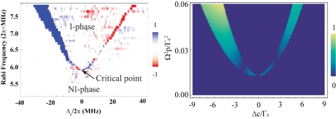 图1是他们根据扫描的光谱信号得到的相图。根据相图可以清晰地区分单体无相互作用相(NI-phase)和多体相互作用相(I-phase)。当一个相互作用范围内的平均里德堡原子数量达到临界值时,相变就会发生,系统就会从NI-phase到I-phase渡越(如图2所示),反之亦然。由于测量的灵敏度在MHz量级,他们可以探测临界点附近系统的动力学演化行为,并且发现系统的演化服从幂指数函数。实验结果和森林火灾模型所预测的一样,这给研究多体动力学中的基本物理开辟了新的道路。