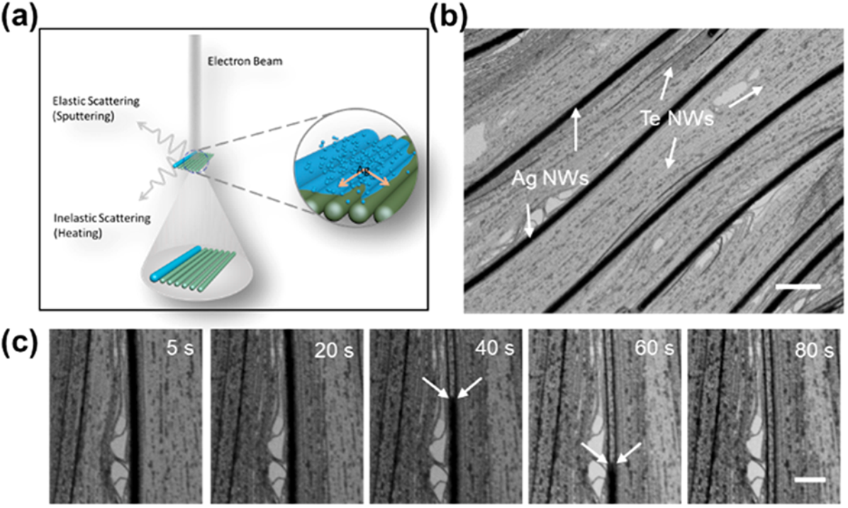 图1. 原位表征有序纳米线的离子迁移过程。(a)原位表征示意图;(b)纳米线共组装结构;(c)Ag离子的动态迁移过程。