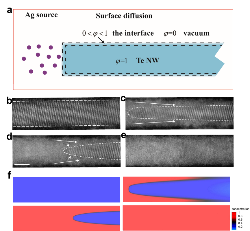 图2. (a) 纳米线内部离子迁移示意图;(b-e) Te纳米线结构变化过程;(f) 相场模拟离子迁移过程。