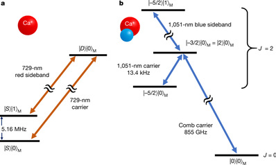 在这项工作中,通过在离子阱体系束缚带电的钙原子和氢化钙分子,使用激光调控制备出他们之间的纠缠态。这样的状态非常奇特:简单来说,当钙离子的电子轨道状态处于基态,分子的转动也在低转动能量状态(由转动量子数描述)的一种整体状态;同时可以“叠加”截然不同的另一种整体态——前者处于轨道的激发态,对应分子处于高转动能量的状态。相反的激发配对也可以制备。这里基态和激发态可以存储量子信息,类似二进制的“0”和“1”,也称为量子比特。为了展示分子状态的频率跨度,实验中选取了转动能量靠近的一对转动态作为比特,频率间隔分别为13.4 kHz(约每秒一万次)以及间隔为855 GHz(每秒近万亿次),分别使用激光脉冲定量演示与原子产生纠缠。