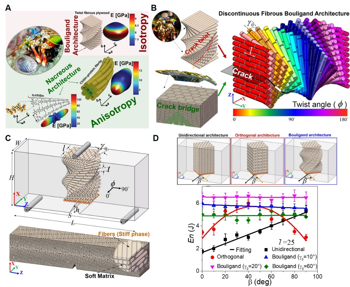 自然界中,捕食者螳螂虾(“矛”)内的扭转结构可促使裂纹偏转增韧,被捕食者贝壳(“盾”)内的“砖泥”交错构型通过砖块滑移促进裂纹桥联增韧,两者都是代表性高韧性生物材料结构。值得思考的是,在这场生存战争中,为什么 “矛”通常会战胜“盾”?为什么自然界中生物材料扭转结构具有特定的螺旋角大小和扭转角分布?如何将生物材料的微结构增韧策略应用于高韧性复合材料的研发?