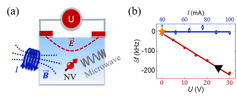 (a) 实验示意图,金刚石表面覆盖电极施加电场,旁边放上通电流的螺线管施加磁场。