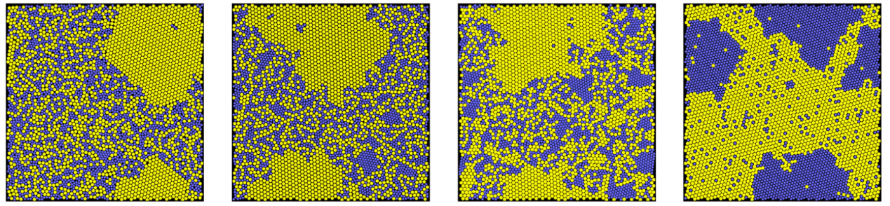 双分散Harmonic粒子体系形成的固体结构随压强的变化。黄色和蓝色用来区分两种不同粒径的粒子,从左往右压强递增。可以看出,随着压强增大,两种粒子的分离越发明显,表明玻璃形成能力变弱。