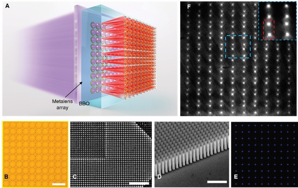 研究者引入超构表面技术,将超构透镜与非线性光学晶体组合在一起,构成全新的超构表面量子光源系统。他们制备出10X10的超构透镜阵列,该阵列将泵浦激光均匀地分成10X10份,在BBO晶体中聚焦发生自发参量下转换过程,可制备100维路径纠缠,也可以产生多光子。增加透镜阵列数还可以进一步提高纠缠光子的维度。