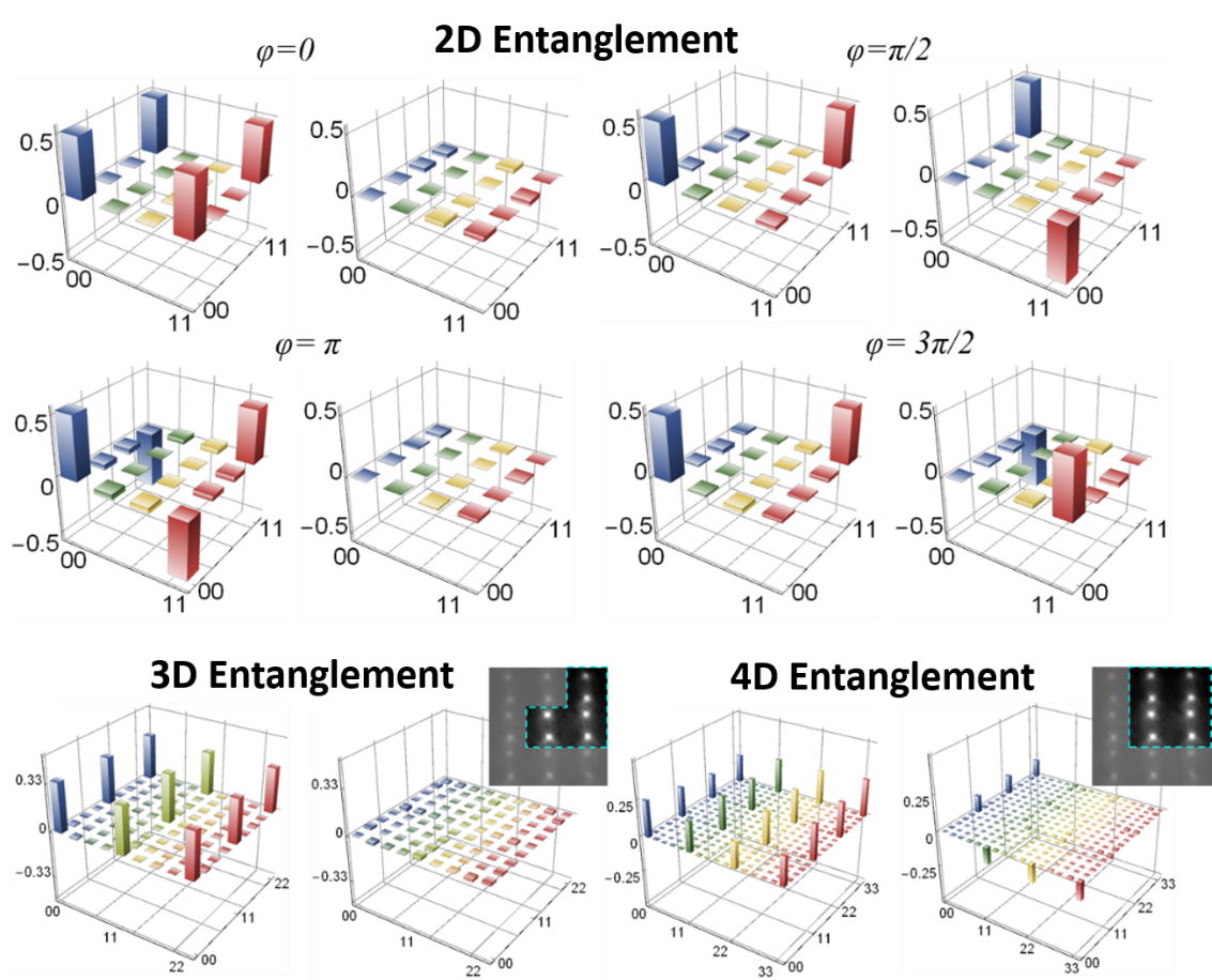 实验测得所构成的二维、三维以及四维路径纠缠态的保真度分别达到98.4%96.6%95.0%。不仅如此,超构透镜具有灵活的光场调控能力,可以对光场的相位、偏振、振幅等集成调控。研究团队通过对超构透镜的相位设计,对所制备的量子纠缠态进行了精细的相位编码,并通过实验进行了很好的证明。在多光子方面,研究者利用415 nm的飞秒激光作为泵浦源,测量了由该系统制备的4光子和6光子的符合曲线,并展示了4光子Hong-Ou-Mandel干涉的结果,得到很高的干涉对比度,证明产生的多光子量子光源具有很好的性质。