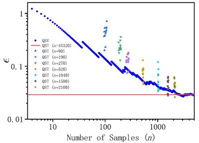 李传锋研究组构造了一组最优的测量基,使得目标态可以确定性的通过这些测量。然后随机选取这些测量基对实际制备的纠缠态进行测试。单次测试通过(输出为1)会造成失真度(度量制备的态相比目标态的失真情况,失真度越小,保真度越大)的估计值减小,而单次测试不通过(输出为-1)会造成失真度的估计值上升。在该实验中,失真度的估计值与测试样本数n成反比关系,也就是实现了1/n的海森堡极限测量精度,这是量子力学所能允许的极限。而通常的量子态测量方法只能实现1/√n的标准量子极限测量精度。这意味着该工作实现了最优效率的纠缠态检验,更重要的是该方法所需要的测试样本数并不随着纠缠态规模增大而增加。