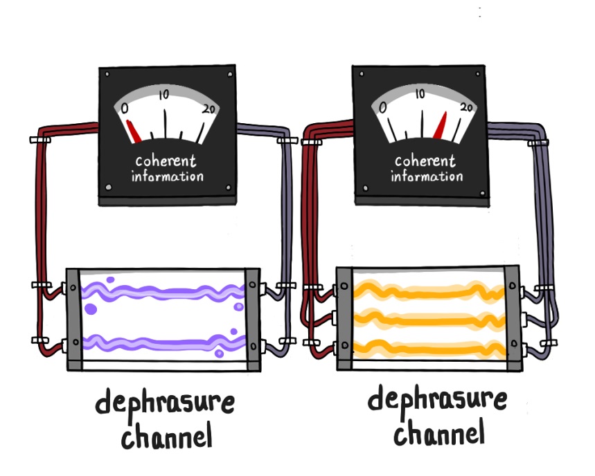 所谓不可加性就好比一个人的左耳和右耳都听不到声音,但把两只耳朵一起用时,却能够听得十分清楚。量子信道容量的不可加性虽然在理论上已经有了充分的研究,但是要在实验上观测到“不可加”的现象却是十分困难的。因为在常见的量子信道中,不可加性的效应十分微弱,难以实验观测。为了能实际观测到这一现象,李传锋研究组在实验上构建了一种同时具有“退相”和“擦除”性质的量子信道,即“退相并擦除”(dephrasure)量子信道,首次明显且直接地观测到了量子容量中相干信息的不可加性。在实验中,研究人员搭建了一套具有n次复用能力的量子信道(n-fold quantum channel)。相干信息的不可加性在实验中就体现在使用两条具有单次复用能力的信道下测得的相干信息,并不等于使用一条具有双重复用信道的相干信息。同时,研究人员还发现,在使用双重和三重复用的信道时,其相干信息与在使用单重复用信道下测得的结果存在着明显的差值:在单重复用信道下测得相干信息量为零的情况下,双重和三重复用信道下的相干信息依旧存在。这就证明了量子相干信息的不可加性。