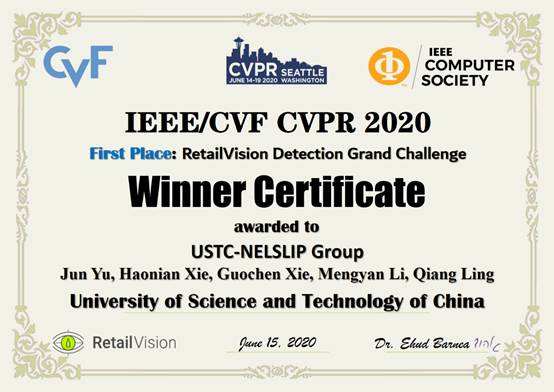 2020年6月14—19日期间,CCF A类国际顶级会议-国际计算机视觉与模式识别大会(以下简称IEEE/CVF CVPR 2020,图1)主办的超大规模商品图像检测挑战赛(以下称“RetailVision Detection Grand Challenge”)举行了颁奖典礼。由来自语音及语言信息处理国家工程实验室语音情感计算及多模态交互研究室和中国科大信息学院自动化系组成的参赛团队(以下简称USTC-NELSLIP参赛团队)在挑战赛中斩获第一名的佳绩(图2)。团队工作由於俊副教授等指导研究生谢皓年、谢国辰和李梦岩完成。