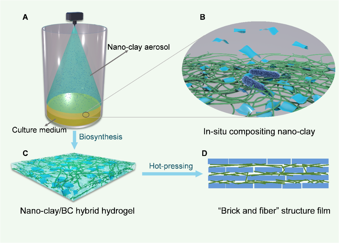 图1. 高性能可持续仿贝壳透明薄膜的制备过程与结构示意图。(A-B) 常温常压下微生物辅助合成复合水凝胶的过程。(C) 具有三维纳米纤维网络结构的复合水凝胶。(D) 高性能可持续仿贝壳透明薄膜内部的“砖-纤维”结构。