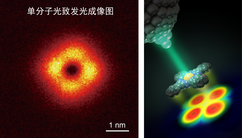 图注:左图为亚纳米分辨的单分子光致发光成像图。右图为光致发光成像技术的艺术化原理示意图。